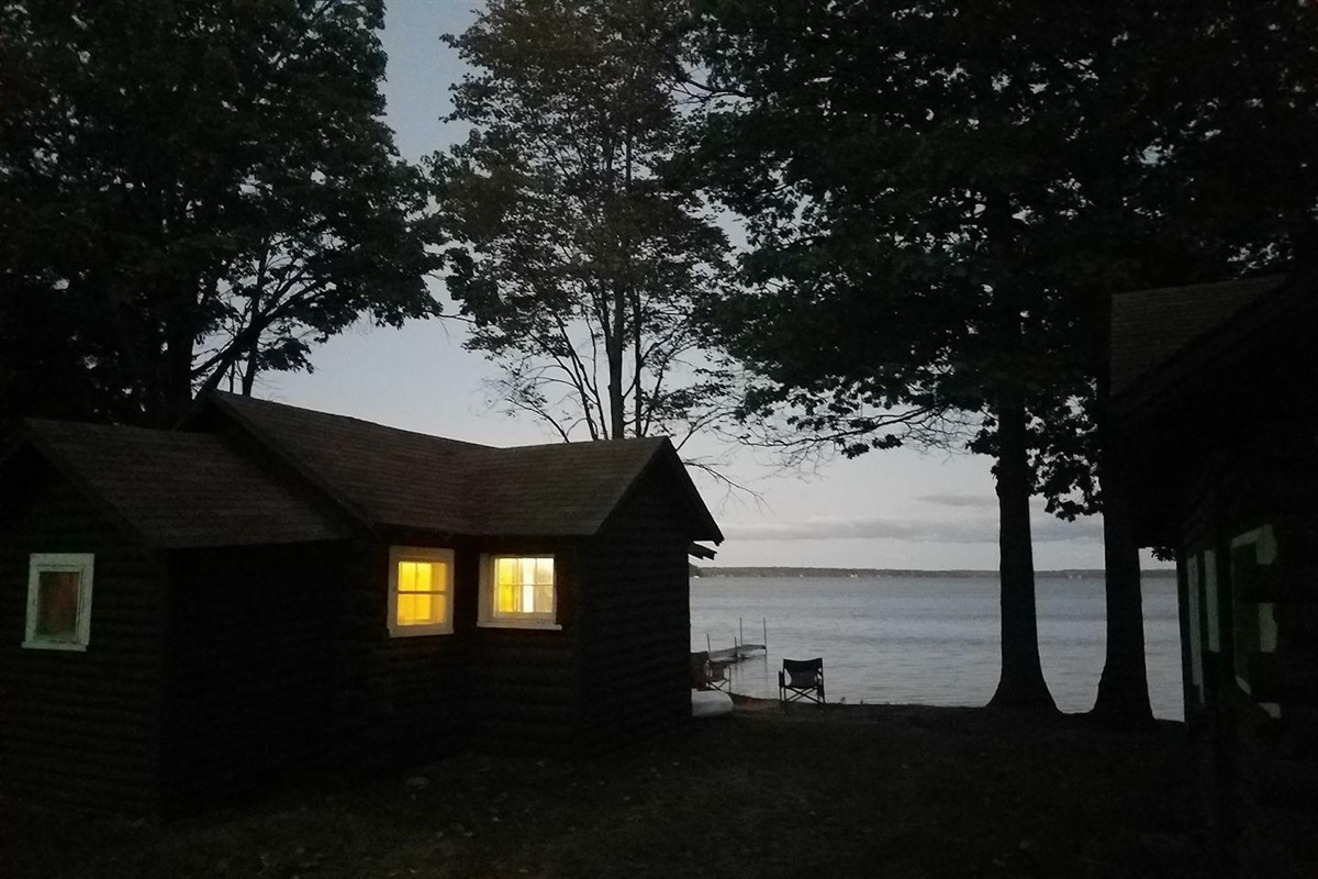 This one room cabin is 202 sq ft and sleeps 2 people in the queen size bed which adjoins the kitchen and dinette. The bathroom is simple, the shower is warm and the kitchen has everything to cover your basic needs. The spacious 10’x7' enclosed porch overlooks the water. A perfect area to enjoy a quiet evening watching the loons. The cabin has 1 electrical outlet near the bed and other electrical outlets minimally located throughout the cabin.